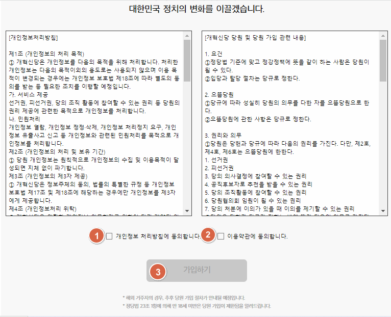 2. 당원 가입서가 나오면 [개인정보처리방침]과 [개혁신당 당원 및 당원 가입 관련 내용]을 읽어본 후 아랫부분에 있는 개인정보처리방침과 이용약관에 동의 후 가입하기를 누르면 됩니다