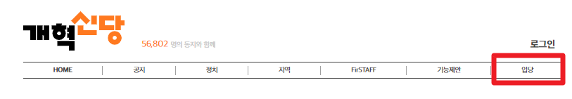 1. 홈페이지에 로그인해서 오른쪽 끝에 있는 입당을 클릭합니다