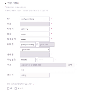 4. 입당 신청서는 ID, 닉네임, 암호, 이메일 등 개인정보를 입력하고 다음 단계로 진행하시면 됩니다.