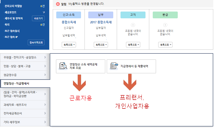 4️⃣ 연말정산/지급명세서 클릭후 ✔프리랜서나 개인사업자인 경우에는 [지급명세서 등 제출내역]을 클릭하고,