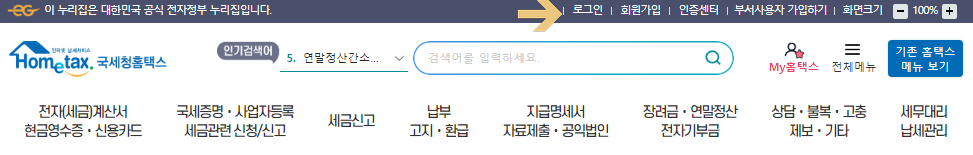 1️⃣ 홈텍스 홈페이지[https://www.hometax.go.kr/]로 들어가서 아래 화살표 부분의 로그인 버튼을 클릭합니다.