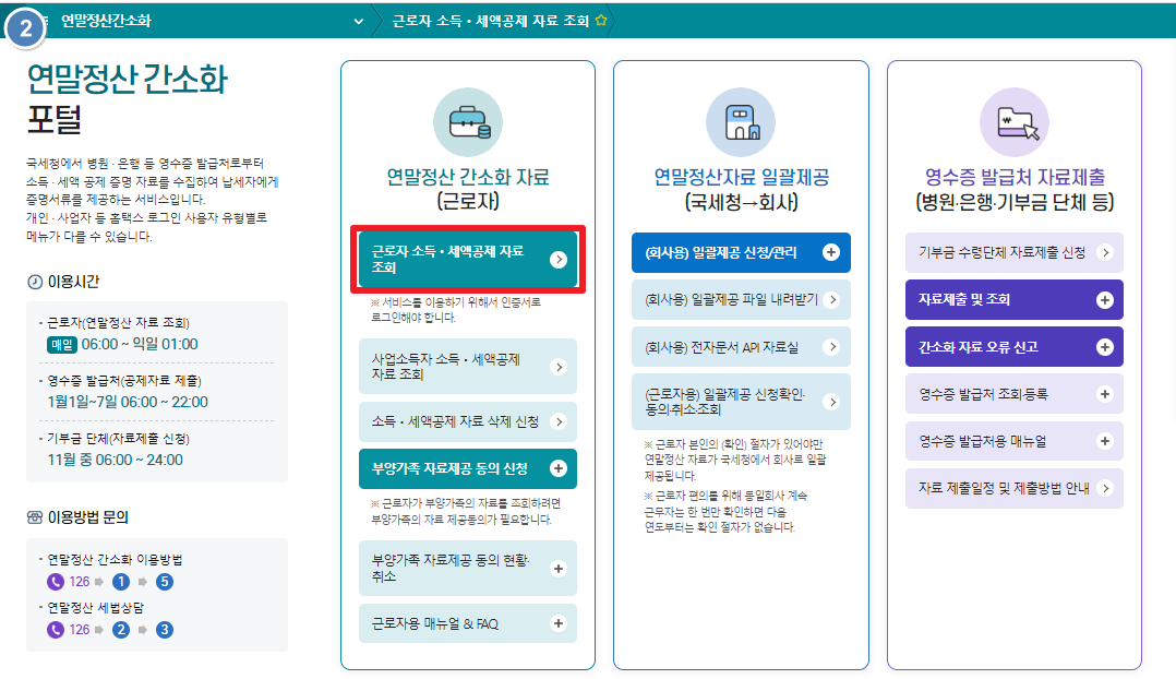 2. "근로자 소득 세액공제 자료 조회"를 선택