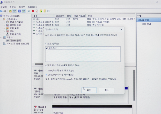 4. 디스크 관리에서 새 디스크가 인식되었다면, 디스크 초기화 화면이 나올텐데, 여기서 MBR과 GPT 중 GPT를 선택하여 디스크를 초기화합니다.
