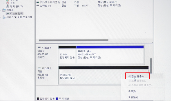 5. 이어서 디스크2를 확인하면 할당되지 않은 볼륨이 있는데, 클릭하여 '새 단순 볼륨'을 선택합니다. 단순 볼륨 만들기 마법사를 통해 크기를 할당하고, 드라이브 문자를 선택한 후 볼륨을 포맷할 것인지 여부를 결정합니다.
